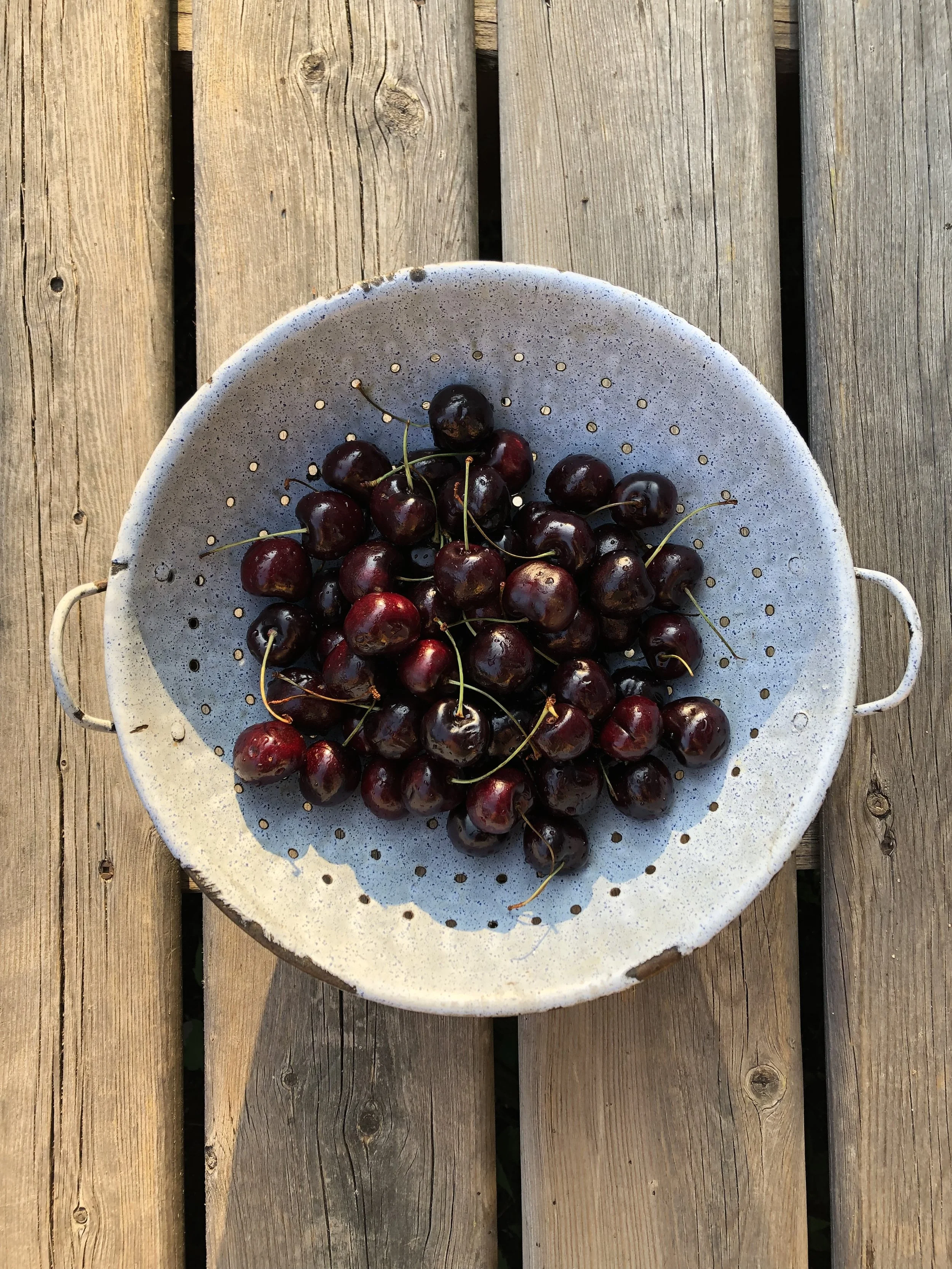 A white ceramic colander filled with dark red cherries on a wooden surface.