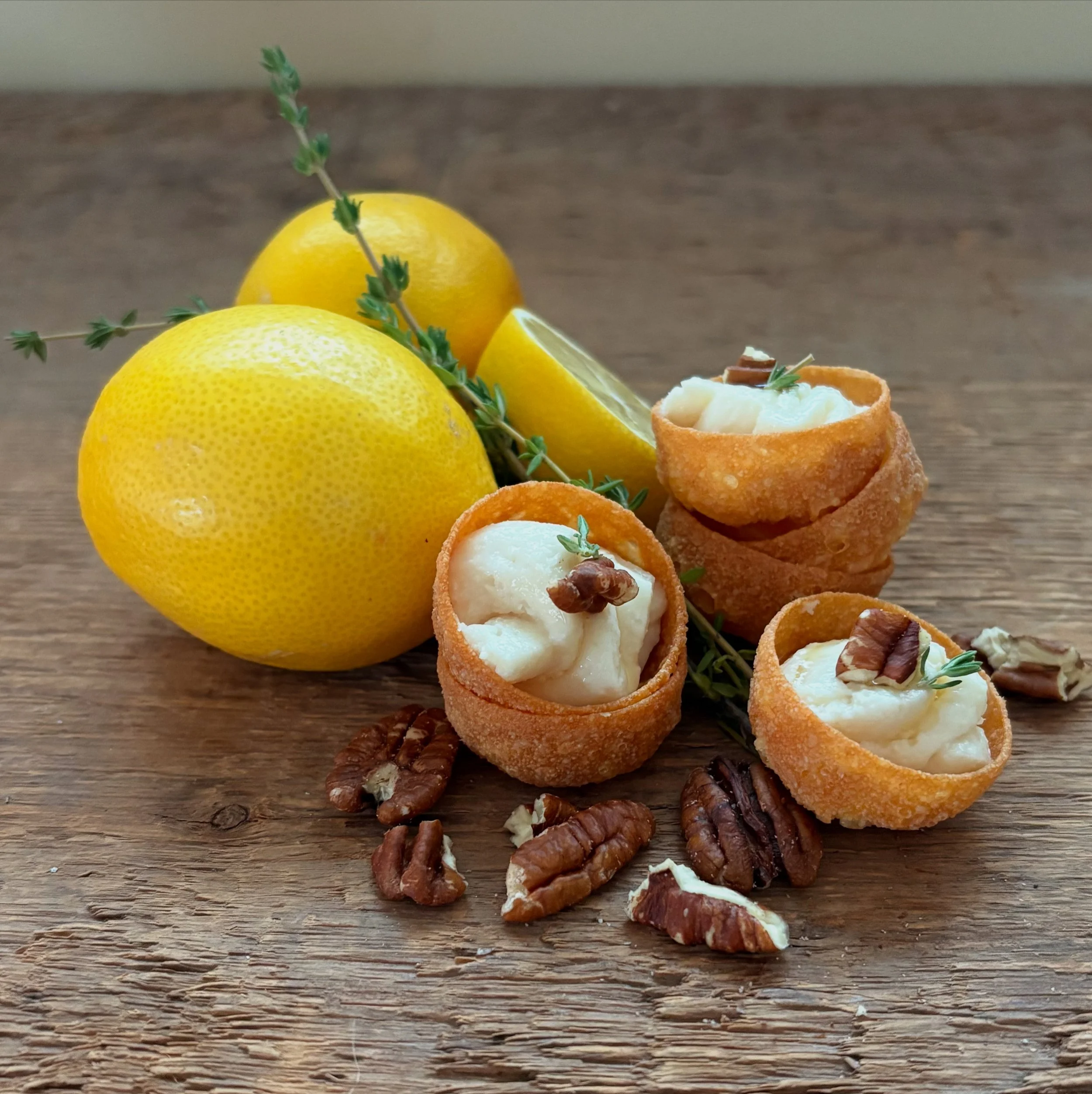 Lemon slices, sprig of thyme, and mini lemon meringue tarts garnished with pecans on a wooden surface.
